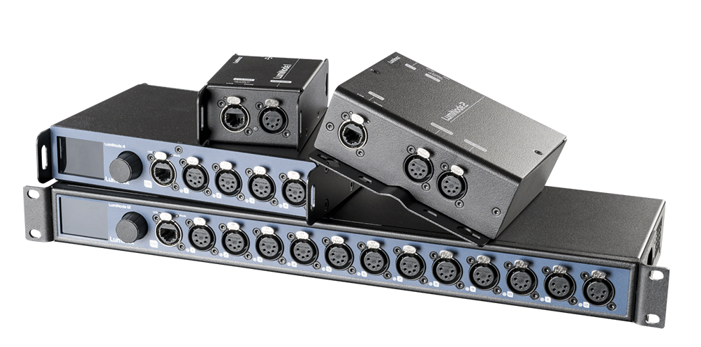 LumiNode 12 與為機(jī)架安裝高密度端口輸出需求而設(shè)計(jì),采用全金屬、堅(jiān)固的 19 英寸外殼,使其成為巡演、劇院和演播室安裝的理想解決方案。配備 2 個(gè) 1Gb Ethercon 端口和 12 個(gè) 5 針 DMX 端口,每個(gè) DMX 端口都是完全先學(xué)和電流隔離的,并且可以配置為輸入或輸出。 支持所有相關(guān)的行業(yè)標(biāo)準(zhǔn)協(xié)議,如 ArtNetsACN、KiNET、RTTRpl (Blacktrax),并丏可以通過 16 個(gè)板載處理引擎支持 HTP、LTP、Crossfade、Backup、Switch 和軟配接的自定義合并模式功能。