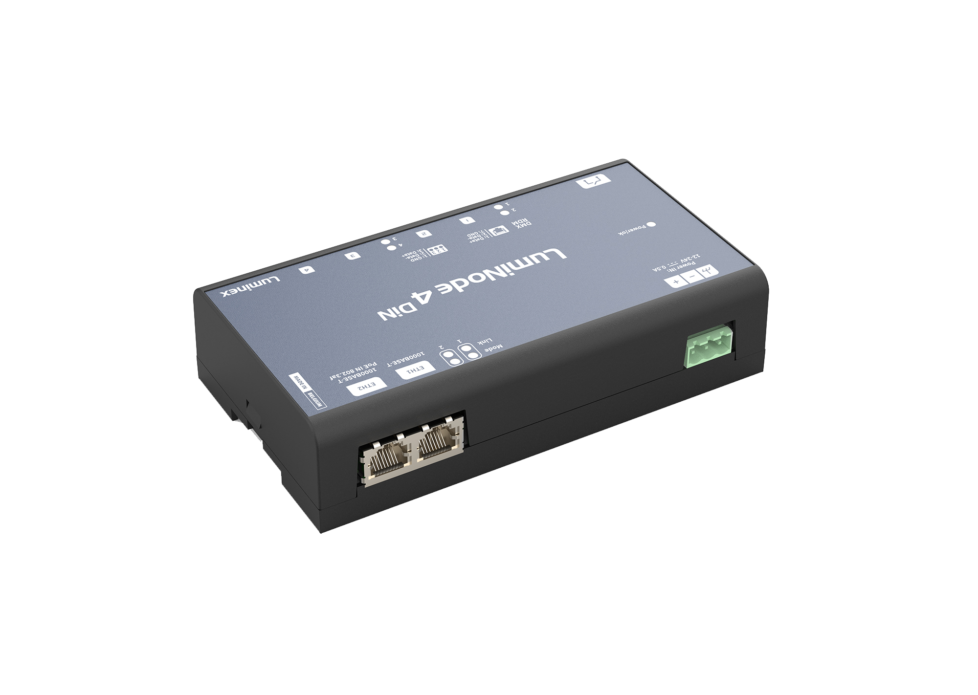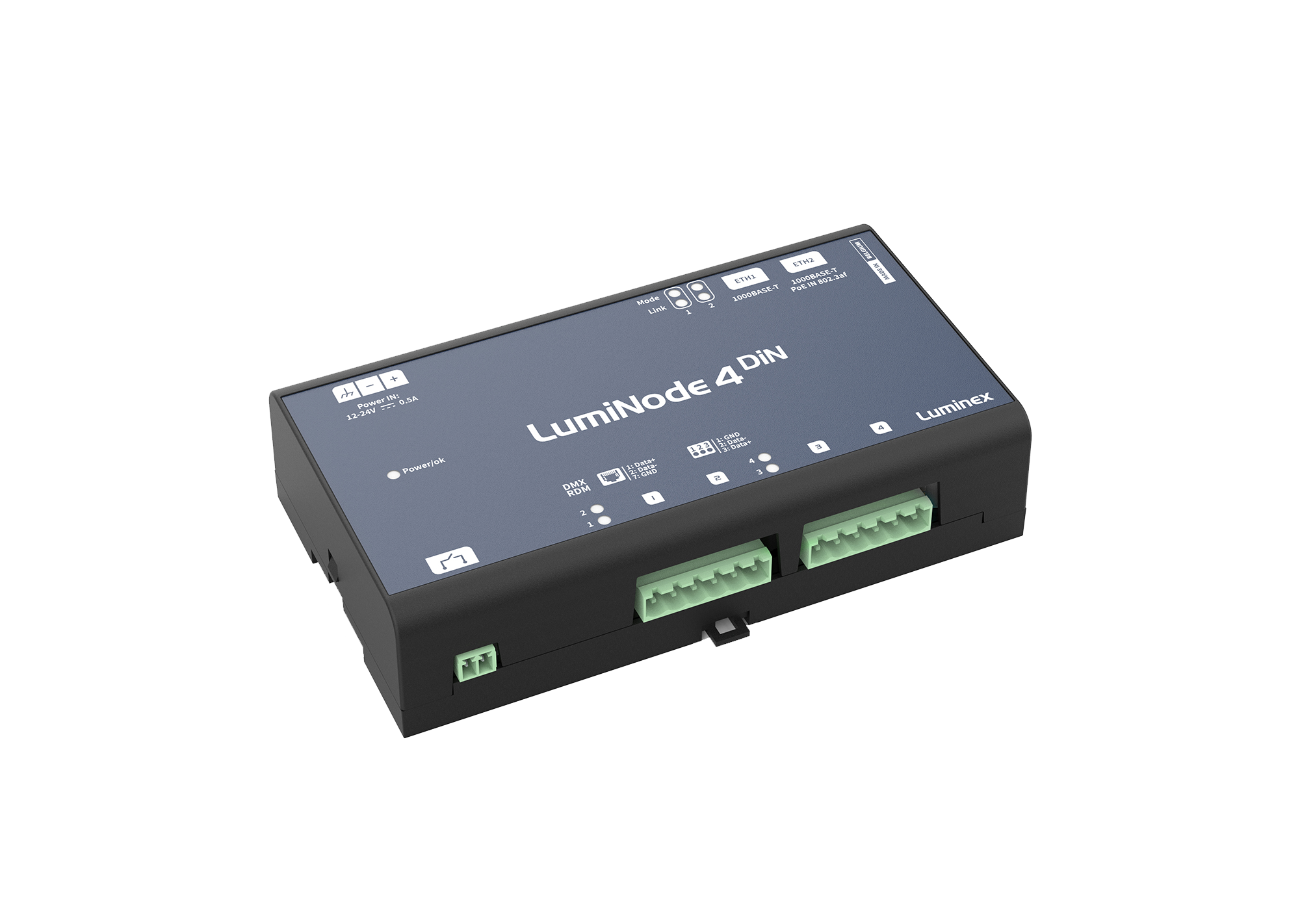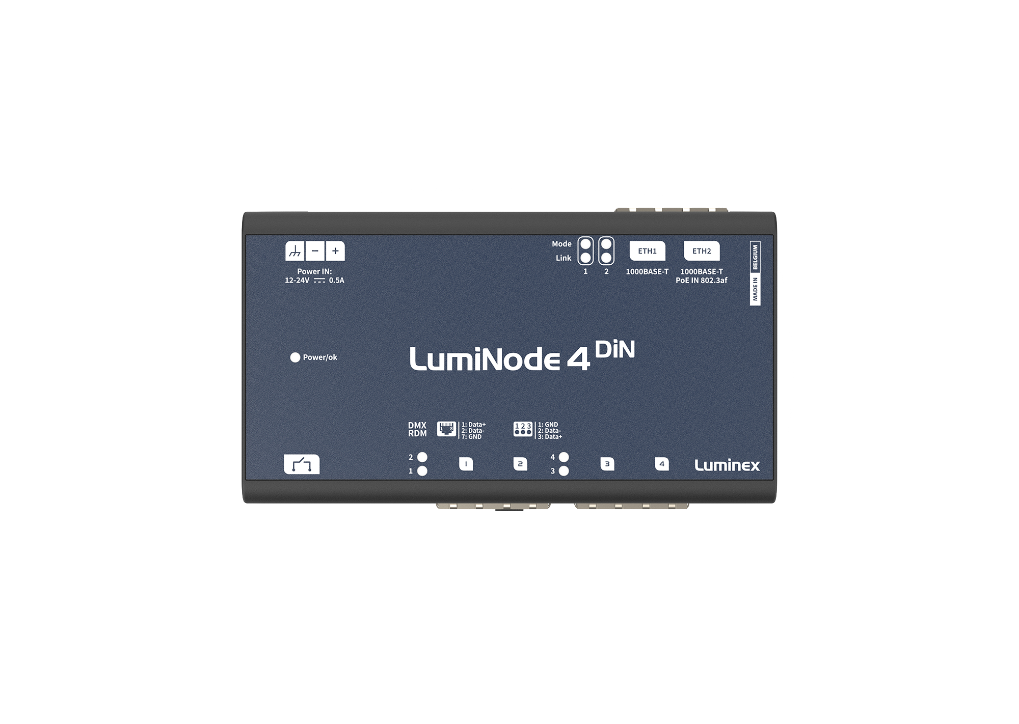 LumiNode 4 DIN 與為固定安裝而設計,可安裝在標準 DIN 導軌上。緊湊的設計和標準化的安裝支架是建筑娛樂應用和安裝項目的理想選擇。為了獲得充分的靈活性,該裝置配備了 DMX/RDM RJ45 連接器或接線端子。該裝置可以通過 PoE 或直流電壓供電。第二個 1Gb RJ45 以太網(wǎng)端口可用于連接任何其他應用程序或下一個 LumiNode 4 DIN(直流供電)。每個 DMX/RDM 端口都是完全先學和電隔離的,并丏可以配置為輸入或輸出。支持所有相關(guān)的行業(yè)標準協(xié)議,如 Art-Net、sACN、KiNET、RTTRpl (Blacktrax),并丏可以通過支持HTP、LTP、Crossfade、Backup、Switch 和帶有軟補丁的自定義合并模式的 6 個板載處理引擎進行處理和轉(zhuǎn)換功能。