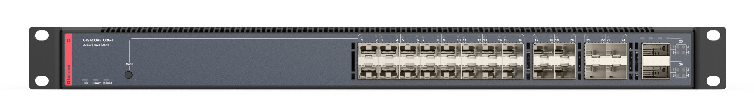 GigaCore O26-I 是一款專門(mén)用于AV集成、安裝和巡演的全光口核心交換機(jī),旨在支持最先進(jìn)的AV協(xié)議,任何需要高帶寬、可靠性和快速、輕松設(shè)置的 AV 網(wǎng)絡(luò)不可或缺的一部分。它是作為具有星型或網(wǎng)狀拓?fù)涞膶I(yè) AV 網(wǎng)絡(luò)的高帶寬骨干網(wǎng)絡(luò)的理想解決方案。20個(gè)獨(dú)立 SFP+端口支持高達(dá) 10Gbps 的速度,4個(gè)SFP 28端口支持高達(dá) 25 Gbps的速度,2個(gè)QSFP端口支持高達(dá) 40 Gbps 的速度,帶寬,連接性和端口可用性不再是問(wèn)題。通過(guò)兩個(gè)內(nèi)置電源單元,它可以在相同的1U機(jī)架空間內(nèi)提供冗余電源。